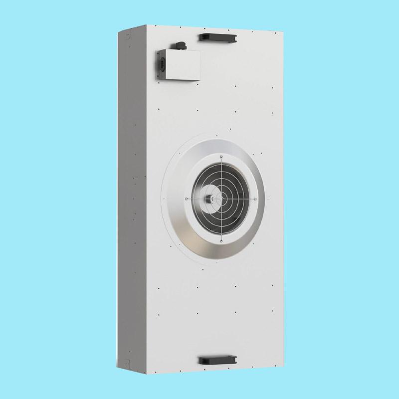 FFU风机过滤机组可模块化链接使用,使得FFU广泛应用于洁净室、洁净工作台、洁净生产线、组装式洁净室和局部百级等应用场合。风机从FFU顶部将空气吸入并经初高效过滤器过滤,过滤后的洁净空气在整个出风面以0.45m/s±20%的风速均速送出。